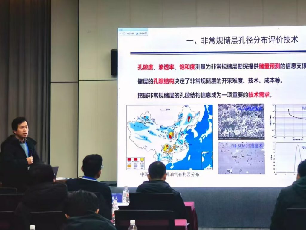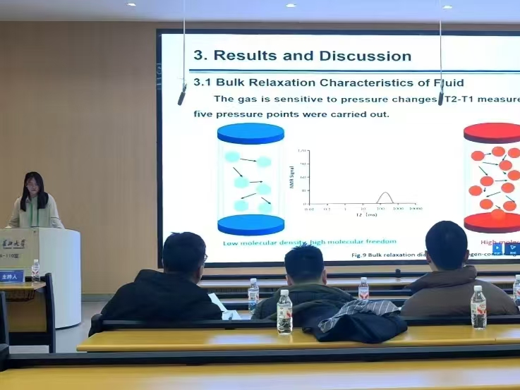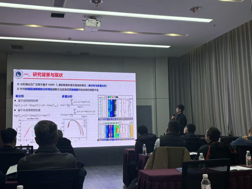 在核磁共振专场,实验室赵冬老师带来了题为《结合NMR和CT技术的页岩储层孔径分布评价方法》的报告,他创新性地提出了将核磁共振与微纳米CT技术相结合,以实现对页岩复杂孔隙结构更精准、更全面的定量表征,报告内容扎实,方法新颖。紧接着,实验室徐陈昱老师汇报了《陆相中低熟页岩油储层核磁共振定量表征方法研究与应用思考》,聚焦于陆相中低熟页岩油这一特殊领域,探讨了核磁共振技术在储层流体识别与定量评价中的应用潜力与挑战,并分享了团队的研究思考。两位老师的报告均引起了与会专家的广泛兴趣,汇报后的讨论环节气氛热烈。