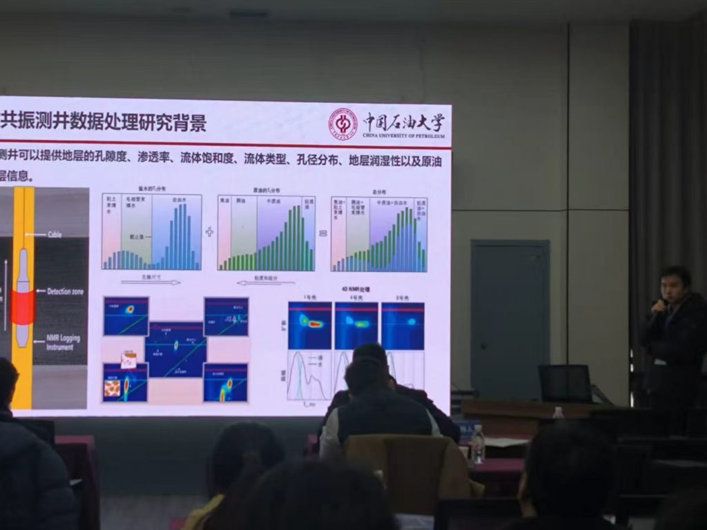 在该专场中,团队成员还聆听了多场高水平学术报告。中国石油大学(华东)葛新民教授分享了《页岩油核磁共振响应分子动力学模拟方法及进展认识》,从微观分子模拟的视角深入解析了页岩油在纳米孔隙中的核磁共振响应机理,提升了理论认知的深度。苏州纽迈分析仪器股份有限公司吴飞高级工程师则从仪器方法与应用角度,报告了《岩屑孔隙度核磁共振测试方法开发及对比》,展示了面向现场岩屑快速评价的创新测试技术与应用效果。这些报告内容涵盖了从基础理论模拟、新型仪器方法研发到油田现场实际应用的全链条,系统而立体地展示了核磁共振技术在非常规储层精细评价中的最新进展与强大生命力。